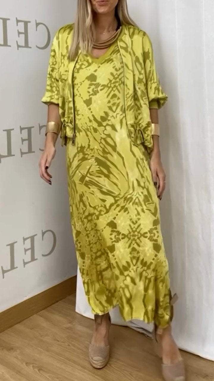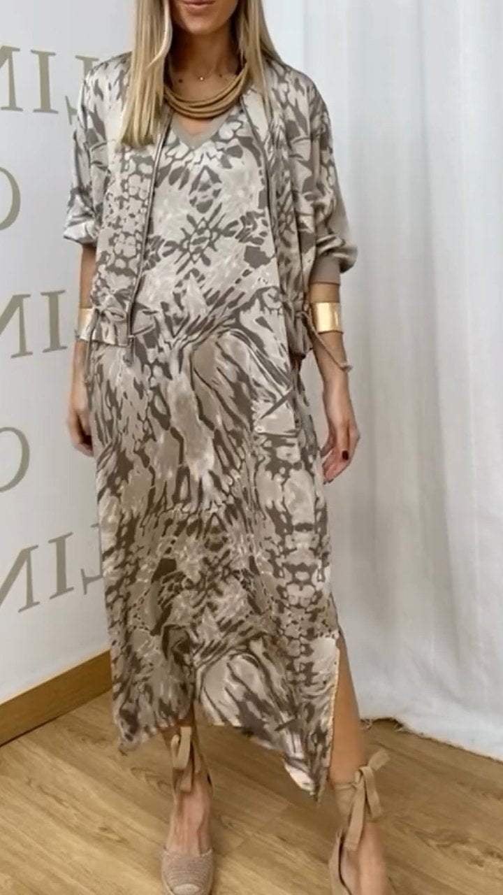 This versatile two-piece set combines a chic sleeveless dress with a stylish jacket, offering the perfect balance of fashion and ease. The dress features a trendy printed pattern, while the lightweight jacket adds a touch of sophistication and warmth. Made from soft polyester, this set ensures all-day comfort without compromising on style. Whether for work, brunch, or a casual outing, this outfit effortlessly transitions from day to night.